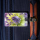 This is a picture of a purple and yellow dahlia flower on a luggage tag with a leather strap. The other side can be customised with your information.
