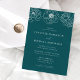 Elegant floral wedding invitations featuring a top border of dainty white flowers with a teal background. Personalize the teal floral wedding invitations with your names and wedding details in white lettering with calligraphy script accents. Designed to coordinate with our Dainty Floral wedding collection.