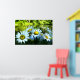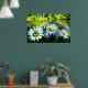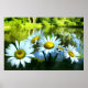 It's a bright, sunny day. Five wild daisies with cheerful yellow centres and white petals are in the foreground. A shimmering pond surrounded by green shrubs and trees is in the distance. Someone just might wander through and pick off each petal while saying "he loves me, he loves me not".