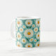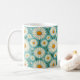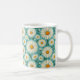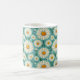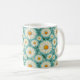 Cheerful floral pattern featuring white daisies with yellow centres overlying a soft blue tone, radiating freshness.