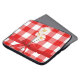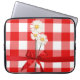 White daisy bouquet with red ribbon and bow on red and white buffalo plaid pattern.