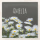 Modern, stylish personalised coaster with sunny daisies on dark grey background.