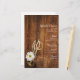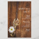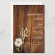 Customise the casual yet classy White Daisy and Horse Bit Country Western Wedding Menu with the details of the meal that you will serve at your farm style or ranch theme bridal shower luncheon, wedding brunch or barn party marriage reception dinner by adding the salad or first course, entree or second course and dessert or third course. This rustic chic custom equine theme nuptial menu features a quaint floral photograph of a white daisy flower blossom, pearl necklace, horse bit and leather reins with a brown weathered barn wood background.
