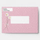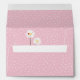 Lady bug and white daisy bouquet with white satin bow on white polka dots and blush pink background.