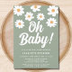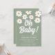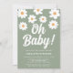 This floral baby shower invitation is decorated with hand-drawn daisies and stylish white retro typography on a green background.