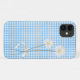 Daisy bouquet tied with white satin bow on aqua and white gingham background.