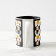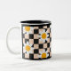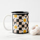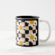 Daisy Coffee Mug with a chequerboard background in colours of yellow, white, and black.