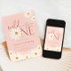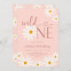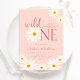 Daisy floral wild one 1st birthday party invitation. Cute trendy design in blush pink. Features wildflowers and heart font. You can choose printed invitations and/or instant download digital template. Perfect for a stylish boho first girls bday celebration.