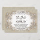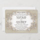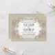 Country rustic and soft vintage look of burlap with white floral design wreath that encompasses this romantic typography style text for a unique wedding invitation. Customise text and fonts to suit your own style. All parts of these invitations are printed. There is no actual burlap connected to this printed invitation.