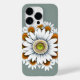 A digital painting features a cluster of daisies arranged in a circular pattern against a solid grey background. The daisies are rendered with a clean, graphic style, emphasizing their geometric shapes and contrasting colours. The petals of the daisies are predominantly white, with subtle grey shadows that give them a three-dimensional appearance. The petals are smooth and have a slight sheen, suggesting a polished or glossy finish. The centres of the daisies vary in colour, with some featuring a bright orange hue and others displaying a mix of yellow and green. The central disc of the largest daisy is particularly detailed, with a textured pattern that mimics the natural structure of a flower's seed head. The overall composition is balanced and symmetrical, with the daisies arranged in a way that draws the eye to the centre of the image. The use of a solid background helps to isolate the flowers and emphasize their form and colour. The painting has a modern, minimalist aesthetic, with a focus on clean lines and simple shapes.