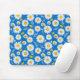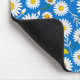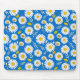 Vibrant and cheerful pattern of daisies against a bright blue background. The daisies are primarily white, with bold yellow centres, and they are arranged in a scattered yet balanced manner. In addition to the flowers, there are various green leaves and delicate stems interspersed throughout the design, adding a touch of nature and freshness. The overall composition creates a lively, summery feel, making it visually appealing and inviting.