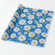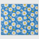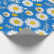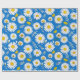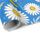 Vibrant and cheerful pattern of daisies against a bright blue background. The daisies are primarily white, with bold yellow centres, and they are arranged in a scattered yet balanced manner. In addition to the flowers, there are various green leaves and delicate stems interspersed throughout the design, adding a touch of nature and freshness. The overall composition creates a lively, summery feel, making it visually appealing and inviting.