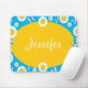 Nothing brings sunshine and happiness like white and yellow Daisies. This cute mousepad features abstract daisy flowers and butterflies on a bright turquoise blue background. The mousepad is customised with your name printed on a bright golden yellow centre oval circle. Personalised floral mousepads make great gifts for yourself or the special flower lover in your life.
