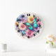 A clock with a beautiful illustration. A heart-shaped bouquet of flowers in pastel blue, green, purple and yellow. With a lovely blue butterfly hovering in front.