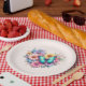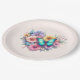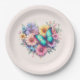 Paper plates with a beautiful illustration. A heart-shaped bouquet of flowers in pastel blue, green, purple and yellow. With a lovely blue butterfly hovering in front.