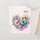 A postcard with a beautiful illustration. A heart-shaped bouquet of flowers in pastel blue, green, purple and yellow. With a lovely blue butterfly hovering in front.