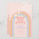 Retro inspired Four Ever Groovy 4th birthday invitation with hippie style pastel rainbow, and daisies