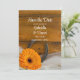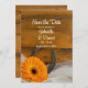 Set the tone for your impending ranch theme marriage ceremony with the rustic chic Orange Daisy and Horseshoe Country Western Wedding Save the Date Announcements. This charming custom equine theme wedding keep the date announcement features a quaint floral photograph of an orange gerber daisy flower blossom and rusty horseshoe with a white bridal veil and a weathered brown barn wood background. Perfect inspo or idea for a cowgirl bride and cowboy groom planning a casual farm style barn party ceremony and reception celebration event. Available as a printed invitation for mailing or as a digital download for easy sharing digitally online.