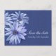 Stunning fine art painting osteopermum calenduleae wedding save the date invitation. Simple and romantic wedding save the date invite, in blue purple and white to lilac shades. Classic wedding design part of the daisy romantic wedding stationary set. Edit this save the date wedding postcard with your names, dates and own wording. Uniquely painted in gouache on dark paper by artist and designer Sarah Trett.