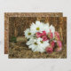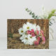 A wedding invitation featuring an photo of a bouquet of daisies and pink flowers resting on a bale of hay. Opposite side features hay background. Personalise the text with details of your occasion.