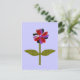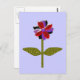 This pretty floral postcard features a digital image of a daisy with a green stem with two green leaves on it and purple, red and black coloured petals with a purple centre. The petals look like they are made of shining plastic that has caught the light and caused an iridescent effect. The background is a calming blue colour.