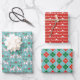 Wrapping paper sheet set with three matching Christmas patterns: Swedish Dala horses in white with greenery, flowers, and hearts; red and white florals; and green, red, blue, and white plaid.