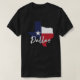 Dallas, Texas flag map design men's black T-Shirt. This design features the word "Dallas" in an elegant script, calligraphy style font in white with light grey outline on top of the map of the state that's filled with the flag of Texas. This hometown T-Shirt is a great way to show that you are proud to be from Dallas, TX.