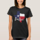 Dallas, Texas flag map design women's black T-Shirt. This design features the word "Dallas" in an elegant script, calligraphy style font in white with light grey outline on top of the map of the state that's filled with the flag of Texas. This hometown T-Shirt is a great way to show that you are proud to be from Dallas, TX.