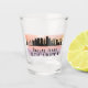 Shot glass features Dallas Texas city skyline silhouette with watercolor splash and latitude & longitude map coordinates