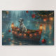 Set sail into the magic of the holiday season with this beautifully detailed illustration, showcasing a proud dog sitting in a festively decorated boat, gliding across a serene Christmas lake. The twinkling lights from nearby pine trees reflect off the water, casting a warm, festive glow that enhances the cosy ambiance. Ornaments dangle from the boat's sides, while glowing lanterns light the way, creating a scene that captures the true essence of Christmas warmth and joy. This nostalgic artwork brings a touch of holiday magic to any space, perfect for those who cherish the spirit of the season.