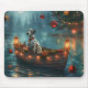 Set sail into the magic of the holiday season with this beautifully detailed illustration, showcasing a proud dog sitting in a festively decorated boat, gliding across a serene Christmas lake. The twinkling lights from nearby pine trees reflect off the water, casting a warm, festive glow that enhances the cosy ambiance. Ornaments dangle from the boat's sides, while glowing lanterns light the way, creating a scene that captures the true essence of Christmas warmth and joy. This nostalgic artwork brings a touch of holiday magic to any space, perfect for those who cherish the spirit of the season.