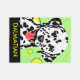 Colourful dog art featuring white Dalmatian with black spots against a light green background and yellow circles, breed name printed on black background