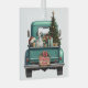 A teal blue retro pickup truck carries a decorated Holiday tree and gift packages on this cute glass Christmas ornament. Looking out from the tailgate is a beautiful Dalmatian Dog. A Santa Claus hat sits on one of the gift packages, and a rustic wooden sign on the back bumper says "Christmas Cheer".