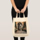 The printing came out very well, better than I had anticipated. The natural color fabric is sturdy with strong seams and comfortable handles. This tote fits easily over my shoulder. As it is filled, the bottom flattens out--very cool! I would buy this product again. This grocery tote holds a lot of groceries! The image quality was very good. The colors were a little darker than I had expected. The darkness may have been due to printing on a natural color fabric rather than on white. The cat design is attractively centered on the tote. The spirit of the design is very lively, just as it appears on the Zazzle website.