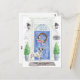 Announce your new address with our stylish announcement featuring a Dalmatian, blue front door, welcome mat, slate sign, topiaries and a floral wreath set on a grey brick background.