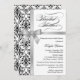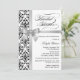 © 2013 Socialite Designs. Our elegant black damask bridal shower invitation has a faux silver ribbon and bow design. If you require additional matching wedding products such as thank you cards, please do not hesitate to contact Socialite Designs. PLEASE NOTE THAT THE RIBBON IS AN IMAGE AND PRINTED ONTO THE INVITATION. The fancy script "Bridal Shower" text image can be moved, resized or deleted.
