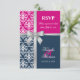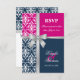 © 2013 Socialite Designs. Elegant wedding invitation RSVP card for a summer wedding incorporating white damask, a printed cross silver ribbon and bow, and two background colours of navy blue and fuchsia. Please contact Socialite Designs if you would like a different colour combination, help with customising, or other wedding products created with this design. PLEASE NOTE THAT THE RIBBON IS AN IMAGE AND IS PRINTED ONTO THE INVITATION.