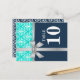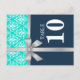 © 2013 Socialite Designs. Our elegant white damask table number card has a faux silver ribbon and bow design and is a perfect addition to your wedding or special event. The background has colours of navy blue and aqua turquoise. Just replace the number on the card for each table. Do you like this design but would like to have it in a different colour, please do not hesitate to contact Socialite Designs. PLEASE NOTE THAT THE RIBBON IS AN IMAGE AND PRINTED ONTO THE CARD.