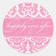 Happily ever after sticker on a classy pink and white damask background.