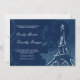 Swirls, reminiscent of a heart, billow and curl about a stunning white hand-drawn Eiffel Tower against lavish, floral damask. A French love poem is faintly inscribed in the dark sapphire background, providing the perfect accompaniment to the customisable wedding invitation wording in script and engraving style fonts, also in stunning white.