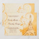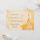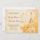 Swirls billow and curl about a burnt sienna hand-drawn Eiffel Tower against lavish, floral yellow and orange damask, accented with faint touches of a stylised dandelion pattern. A French love poem is faintly inscribed in the cream background, providing the perfect accompaniment to the customisable wedding invitation wording in script and engraving style fonts, also in burnt sienna.