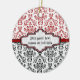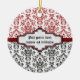Damask pattern black red white custom ornament. The upper part is of red and white damask pattern and the bottom part is of black and white. A red stripe separates the two parts. Your text is typed on an elegant label with white and red outline. A great keepsake for special occasions weddings, birthdays, anniversaries.