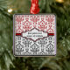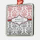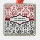 Damask pattern black red white custom ornament. The upper part is of red and white damask pattern and the bottom part is of black and white. A red stripe separates the two parts. Your text is typed on an elegant label with white and red outline. A great keepsake for special occasions weddings, birthdays, anniversaries.