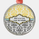 Damask pattern black white yellow aqua ornament. The upper part is of yellow and white damask pattern and the bottom part is of black and white. An aqua stripe separates the two parts. Your text is typed on an elegant label with white and yellow outline. A great keepsake for special occasions weddings, birthdays, anniversaries.
