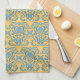 This kitchen towel has a damask element / motif, created by Kristie Hubler, repeated, in a robins egg blue / ocean blue / aqua blue colour, with a light yellow pumpkin / Italian / Mediterranean gold coloured background.  Old worldly, again, Mediterranean looking.