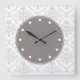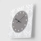 Grey damask wall clocks with grey damask pattern clock face in this decorative wall decor clock design for your kitchen, bathroom, or any room in your house you want to add some colour and character. Colours include grey, white and black.