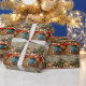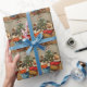 Retro greeting card artwork depicting a puppy and kitty holding paws as they dance around a Christmas tree.