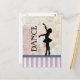 A cute postcard with a silhouette of a ballerina on a pretty background. This elegant ballet dancer is standing on her toes, en pointe with her arms outstretched gracefully. The word "DANCE" written beside this elegant dancer. The background is composed of a shabby vintage looking pattern with flower blossoms. The bottom portion of the design has vintage style lavender stripes alternating in dark and light colours.