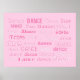This pretty poster is sure to delight any dancer! Dance is displayed in many stylish fonts, all beautifully arranged in pink and white against a pink background.