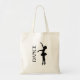A nice tote bag with a silhouette of a ballerina. This elegant ballet dancer is standing on her toes, en pointe with her arms outstretched gracefully. The word "DANCE" is written beside this elegant dancer.